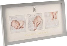 Рамката е част от колекцията Bambino, в която ще откриете още бебешки и детски продукти по темата. ... Рамката за снимки Welcome to the World на Widdop Bingham е стилно и емоционално допълнение към интериора на дома, посветено на първите спомени от живота на вашето дете. Тя разполага с 3 квадратни отвора, подходящи за снимки с размер 10 x 10 cm, и е изработена от MDF с матово сиво покритие. Може да бъде поставена върху равна повърхност или да се окачи на стена. Декорирана е със сребърно 3D мече, инкрустирано с кристали, и надпис Welcome to the World (Добре дошъл на този свят) в златист цвят, който добавя топлина и ... |