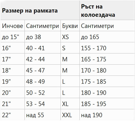 Ако не държите на максималната точност или няма как да се съобразите напълно с формулата, можете да използвате таблицата, която обобщава най-често срещаните размери (в инчове и сантиметри), техните буквени означения и ръста, за който са предназначени. Таблицата не претендира за абсолютна точност, а е изготвена средностатистически по данните и препоръките на различни производители.