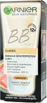 Специално създаден от "Garnier" с грижа за смесената към мазна кожа, този BB крем от серията "Skin Naturals" е перфектен мултифункционален продукт. Леката му консистенция, обогатена с перлит и минерални пигменти изравнява тена, заличава несъвършенствата, матира и видимо подобрява структурата на кожата. Перфектно покритие, без тежестта на фон дьо тен. Формулата му с UV филтри и осигурява защита от вредните UVA/UVB лъчи със SPF 20 и предотвратява преждевременното стареене на кожата. Резултатът е видимо подмладена и сияеща кожа, без лъщене.