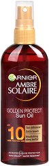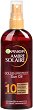 Иновативен слънцезащитен продукт от серията "Ambre Solaire" на "Garnier", който осигурява красив слънчев загар и ефективна защита от изгаряне. Произведен с патентована система от UV фитри "Meroxyl® SX", съгласно европейските стандарти за защита от вредните UVA / UVB лъчи. Обогатено с масло от ший, олиото прави кожата гладка като сатен, а тена - зашеметяващо красив и дълготраен.