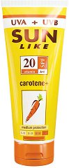 Слънцезащитният лосион на "Sun Like" предпазва кожата от вредното влияние на слънцето и едновременно с това ви помага бързо да придобиете красив слънчев загар. Той предоставя сигурна защита от вредните UVA / UVB лъчи. Лосионът е обогатен с каротин, витамин A и витамин E. Каротинът защитава клетките от увреждащото действие на ултравиолетовата светлина, спомага изравняването на тена и подобряването структурата на кожата. Витамин E има хидратиращи и успокояващи свойства, стимулира регенерацията на кожата, подобрявайки нейната еластичност. Витамин A предотвратява фотостареенето на кожата, причинено от излагането на ... |