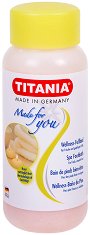 Солите на "Titania" омекотяват, освежават и в същото време облекчават стъпалата след натоварване. Съдържат морска сол, която ексфолира, тонизира и енергизира кожата на ходилата, премахвайки натрупаното напрежение и стрес. Формулата е обогатена и с масло от праскова, което притежава подхранващи и хидратиращи свойства. Добавено е и масло от авокадо, което действа овлажняващо и омекотяващо. И не на последно място, маслото от жожоба хидратира кожата на стъпалата и подобрява състоянието на напуканите пети.