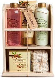 Зарадвайте специална дама и ѝ подарете релаксиращи SPA моменти с козметичния комплект от "IDC". Той включва душ гел, лосион, скраб за тяло, сапун и сизалена кърпа, поднесени в декоративна дървена стойка. Душ гелът и сапунът почистват и освежават кожата, а скрабът я омекотява и изглажда. Лосионът е обогатен с подхранващи и омекотяващи съставки. Козметиката има приятно и освежаващо ухание. ...