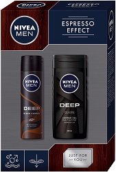 Ако търсите подарък за приятел или за любимия мъж, зарадвайте го с козметичния комплект "Espresso Effect" от "Nivea". Той включва душ гел и дезодорант от серията "Deep".