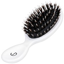 Малката четка на "Dessange" помага в разресването на тънка и коса с нормална гъстота. Компактният ѝ размер е идеален за носене във всяка чанта. Четката е изработена от бяла пластмаса с черна гумена основа, върху която са разположени косъмчетата. Всяко снопче е съставено от дълго пластмасово шипче, което стига безпроблемно до скалпа и основата на косата. То е заобиколено от естествени глигански влакна, придаващи допълнителен блясък. Четката прави разресването лесно и осигурява на прическата френска изтънченост. Като всички останали аксесоари на "Dessange", тази четка е идеален подарък и за най- ...