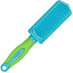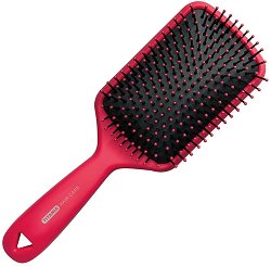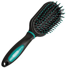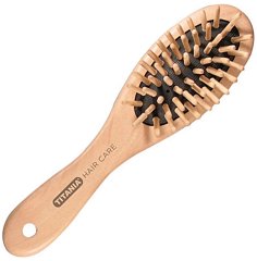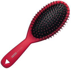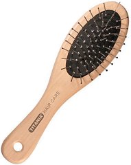 Четка за коса от "Titania" с пластмасови щифтове, чиито топчета щадят скалпа. Те не увреждат фоликулите на косъма и го предпазват от накъсване. С гъсто разположените си щифтове четката е подходяща за дълга, гъста или чуплива коса. Удобна за разресване на коси, склонни към заплитане. С практична гумирана дръжка за по-лесно захващане.