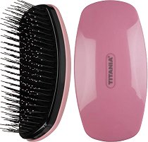 Четката за коса от "Titania" е в практичен малък размер (дължина 18 cm), за да не заема много място в несесера или чантата, когато тръгвате на път. Тя е снабдена с пластмасови щифтове, с топчета по върховете, които са грижовни към скалпа. Щифтовете са прикрепени към гумена възглавничка, която поема натиска по време на ресане.