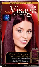 От "Visage" предлагат крем боя за коса в разнообразни цветове. Тя придава наситен цвят, без да изсушава косъма. Това се дължи на специалната формула с копринени и житни протеини. Коприненият протеин има свойството да задържа влагата в косъма и да предпазва от цъфтене. В комбинация с житните протеини, придава на косата блясък и еластичност.