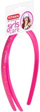 Спрете досадното влизане на кичури коса в очите със стилните диадеми на "Titania". Те се предлагат в комплект от 2 броя в опаковка. Едната диадема е с шарена повърхност на малки сърца в различни цветове, със сребристи брокатени точки, а втората е с изчистен цвят. Изработени са от пластмаса, като от вътрешната страна имат малки зъбчета, чрез които по-добре се закрепят към косата. Диадемите са предназначени за деца, но може спокойно да се използват и от по-големи момичета. Подходящи са както за украшение, така и за удобно и лесно фиксиране на косата. ... |