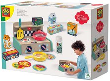 Детската кухня от SES Creative ще даде шанс на малките ви помощници да се развихрят с готвенето! Тя е изработена с фурна и 2 котлона. Също така в комплекта са включени и съдове, продукти и прибори за готвене, за да може малчугана да влезе в ролята на един истински готвач. Комплектът е изработен от картон, пластмаса и дърво, боядисано с безвредни бои на водна основа. Какво ще сготвим за вечеря? Пица или супа? ... |