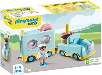 Конструкторът е част от серията Playmobil 1.2.3, където ще намерите още интересни комплекти. ... Вашето дете ще се впусне в сладки приключения с конструктора от Playmobil. Той се състои от 7 части, които включват автомобил, ремарке, мини фигурка и 4 понички. Ремаркето представлява сортер, в който могат да се поставят поничките. Сладките могат да се нанижат и върху колата. Капакът на ремаркето се отваря. Мини фигурката може да се постави на шофьорското място. Колата и ремаркето могат да се свързват и отделят. Развийте фината моторика, въображението, сръчността и когнитивно мислене на подрастващия човек, докато се ... |