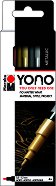 Универсалните акрилни маркери от серията YONO на Marabu се предлагат в комплект от 4 металикови цвята. Разполагат с объл връх, позволявящ равномерно нанасяне на линията между 0.5-1.5 mm. Работят със светлоустойчиво мастило на водна основа. Подходящи са за писане, маркиране, рисуване и декорация върху гладки, порести, светли и тъмни повърхности - хартия, картон, мукава, дърво, текстил, пластмаса и метал. На гладките, неабсорбиращи основи нарисуваното може да се избърше с влажна кърпа. Декорациите върху текстил могат да се фиксират във фурна за 8 минути на 150°С. Начин на употреба: Преди първата употреба ... |