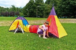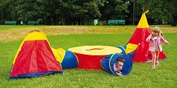 Приключенският цветен комплект включва тунел, палатка и къща, които са изработени от полиестер. Съхраняват се лесно след сгъване и са подходящи за игра в зала и на открито. Комплектът е лесен за сглобяване и с него могат да се изграждат различни трасета с препятствия. Размери: тунел: диаметър ∅ 46 cm, дължина 140 cm палатка: 75 / 80 / 75 cm къщичка: 90 / 75 / 65 cm ... |