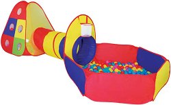 Палатката с тунел и басейн предлага множество възможности за забавление. Едната страна на скривалището има мишена за хвърляне с велкро топчета, а другата разполага с мрежести кошове за игра с пластмасови топки. Конструкцията му се състой от гъвката стоманена тел и е изработен от полиестер. Размерите на палатката, тунела и басейна са 300 / 120 / 100 cm. ... |
