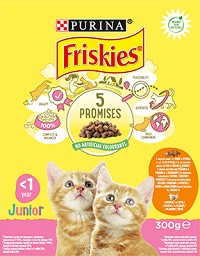 Суха храна за котки Friskies Junior0.3 и 10 kg, с птиче месо, зеленчуци и мляко, от 6 седмици до 1 година Доставка: