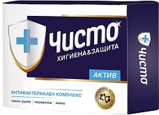 Сапунът "Актив" от "Чисто" почиства грижовно кожата и е надежден помощник в борбата с бактериите. Формулата, с комплекс от натурални екстракти, има антибактериален ефект. Вложените екстракти от чаено дърво, смрадлика и лайка притежават антисептични, антибактериални и противовъзпалителни свойства. Те подсилват почистващото действие на сапуна и ефективно помагат за отстраняване на замърсяваният. След измиване кожата е чиста, мека и хидратирана. Сапунът е подходящ за почистване на ръцете и тялото. Може да се използва от цялото семейство.