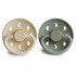 Залъгалките на "FRIGG" са подходящи за бебета от 0+ до 6 месеца. Те са произведени от пластмаса, без съдържание на Бисфенол А и фталати. Биберонът на залъгалките е изработен от устойчив и разтеглив 100% естествен каучук, и е с кръгла форма и размер на зърното 27 mm, което имитира гръдното зърно на майката по време на кърмене, за да пасне оптимално на устната кухина на детето, задоволявайки естествения смукателен рефлекс. Залъгалките са снабдени и с отвори направени като фазите на луната, които позволяват въздуха да циркулира и кожата на бебето да "диша", като по този начин предпазват нежната детска кожа от възпаления, обриви и алергии.