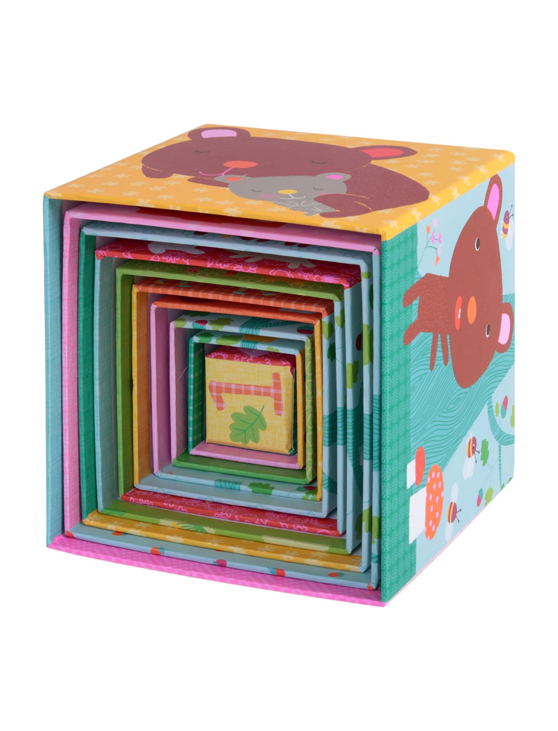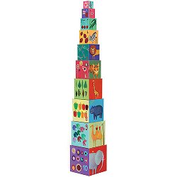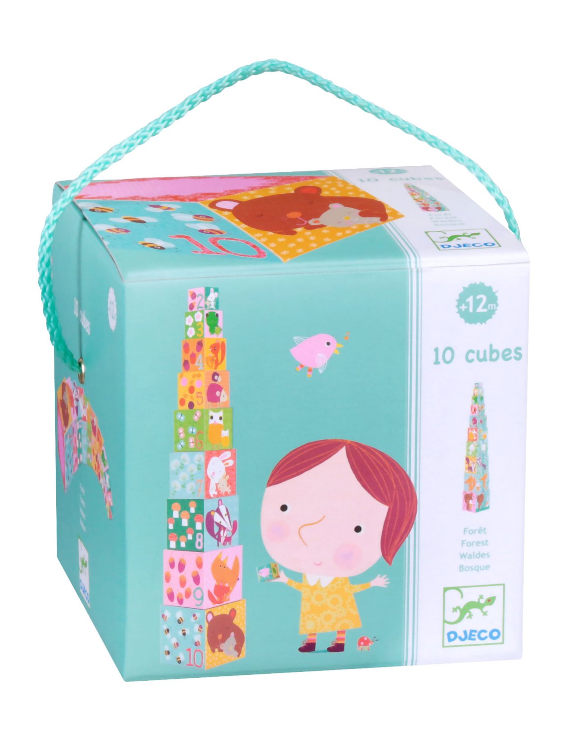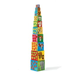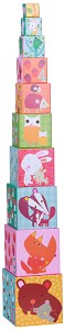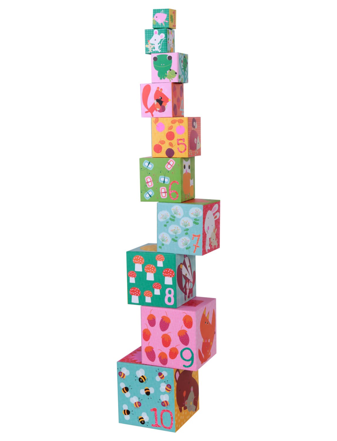 Комплектът на "Djeco” включва 10 различни по размер кубчета изработени от здрав импрегниран картон, с които детето Ви ще може да построи пирамида висока повече от 80 cm. Всяко кубче има номер от 1 до 10, а върху 3 от страните му има картинки на определено горско животно.
