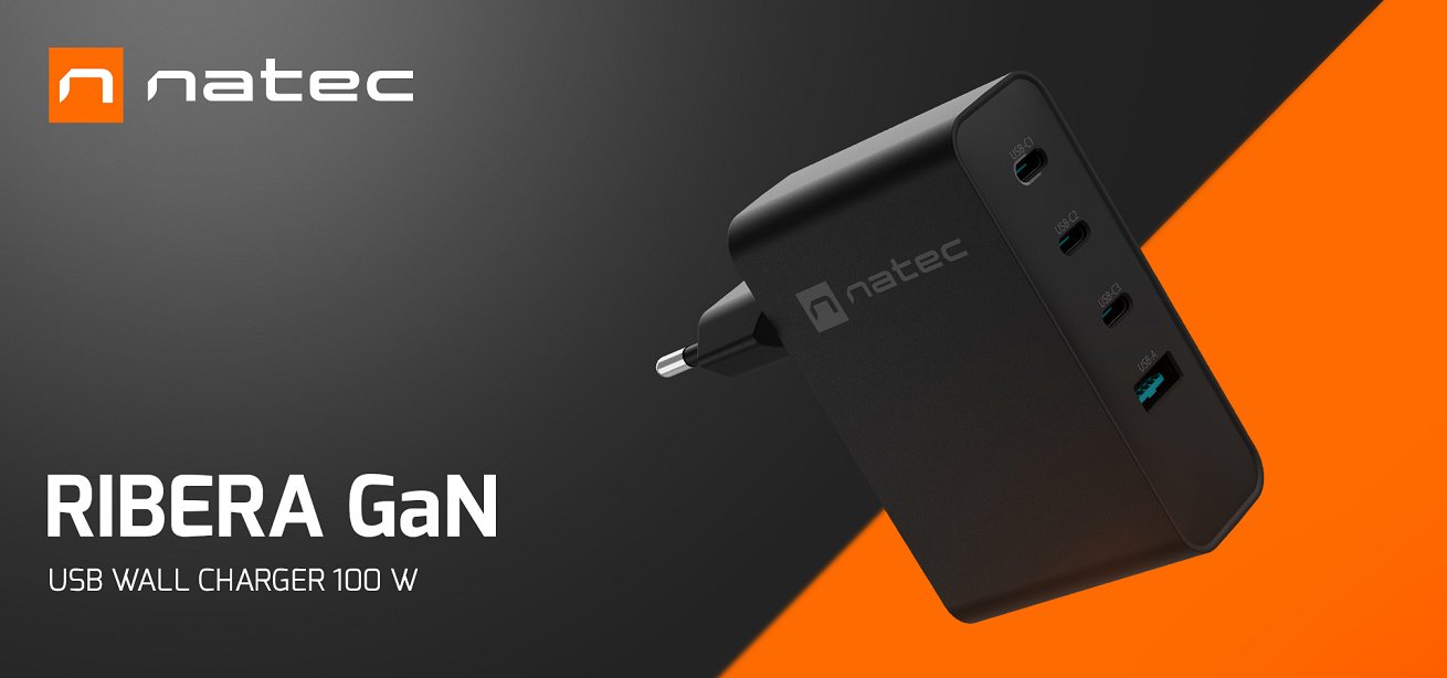 Зарядно устройствo Natec Ribera Gan100 W, USB-A female, 3 x USB-C female Доставка: