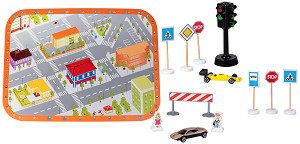 БДП комплект за триизмерно моделиране на ситуации ДидаскоПостелка с улици 78 x 56.5 cm, пътни знаци и аксесоари Доставка: