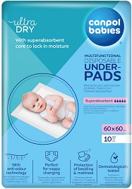 Удобните и хигиенични подложки за еднократна употреба на Canpol babies са полезен аксесоар при смяна на пелените вкъщи, по време на разходка или на път. Те имат мек горен слой, който е нежен на допир до кожата на бебето. Тяхната 5-слойна структура е с водонепропускливи и силноабсорбиращи свойства. Тя попива влагата и я задържа във вътрешността, което осигурява комфорт за бебето и спокойствие за вас. Подложките имат технология за неутрализиране на миризмата и са дерматологично тествани. Освен за преповиване на детето, те могат да се използват и като протектор за матрак, за периода след раждане и като допълнение към абсорбиращите продукти за инконтиненция.