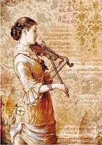 Декупажната оризова хартия от "Stamperia" изобразява жена, която свири на цигулка. С нея може да превърнете предметите за декориране в истинско произведение на изкуството, като им добавите флорални мотиви. Направете приказна кутия за бижута или стилна текстилна чанта.