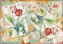 Декупажната оризова хартия на "Stamperia" изобразява лалета, писма и ключ. С хартията може да превърнете предметите за декориране в истинско произведение на изкуството. Направете нежна кутия за бижута или стилна кутия за чай.