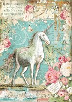 Декупажната оризова хартия на "Stamperia" изобразява еднорог и рози. С хартията може да превърнете предметите за декориране в истинско произведение на изкуството. Направете нежна кутия за бижута или стилна кутия за чай.