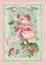 Декупажната оризова хартия от "Stamperia" изобразява красиви рози и птица. С нея може да превърнете предметите за декориране в истинско произведение на изкуството, направете приказна кутия за бижута или стилна текстилна чанта.