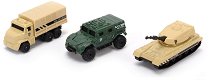 Комплектът за игра от "Dickie" включва три военни превозни средства - танк, камион и бронирана кола. Изработени са от метал с пластмасови елементи, и са реалистични модели на реални прототипи. За да е по-забавна играта, при бутане с ръка колелата се задвижват лесно, като така осигуряват на количките голяма подвижност. Кабината на танка се върти а покривалото на каросерията на камиона може да се махне и така става с открита такава.