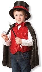 Малките фокусници ще бъдат очаровани от парти костюма и неговите аксесоари, подходящи за забавна ролева игра. Децата могат да накарат стотинката магически да се появява и изчезва, благодарение на скришния джоб или пък да извадят заек от скришния джоб на шапката си. Комплектът включва и наметало с папионка, вълшебна пръчица и книжка с трикове.