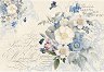 Декупажната оризова хартия на "Stamperia" изобразява нежен букет от сини и бели цветя и надписи. С хартията може да превърнете предметите за декориране в истинско произведение на изкуството. Направете нежна кутия за бижута или стилна кутия за чай.