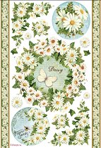 Декупажната оризова хартия от "Stamperia" представлява изображение на маргаритки и пеперуди. С нея може да превърнете предметите за декориране в истинско произведение на изкуството, като им добавите флорални мотиви. Направете приказна кутия за бижута или стилна текстилна чанта.