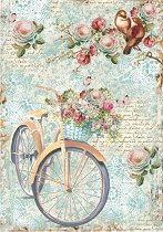 Декупажната оризова хартия от "Stamperia" представлява колело, с кош пълен с красиви цветя и влюбени птички на клон. С нея може да превърнете предметите за декориране в истинско произведение на изкуството. Направете приказна кутия за бижута или стилна текстилна чанта.
