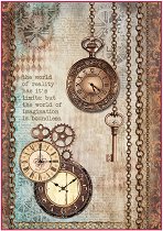 Декупажната хартия от "Stamperia" изобразява часовници и ключове. С нея можете да превърнете предметите за декориране в истинско произведение на изкуството,като добавите флорални мотиви. Направете приказна кутия за бижута или стилна текстилна чанта.