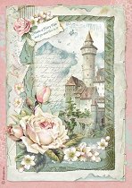 Декупажната оризова хартия от "Stamperia" изобразява замък, рози и надписи. С нея може да превърнете предметите за декориране в истинско произведение на изкуството, направете приказна кутия за бижута или стилна текстилна чанта.