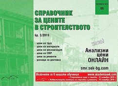 Близки съвпадения: цени, цените Тримесечното издание за цените на СМР и строителната отчетност. ... Включва: цени на труд цени на материали цени на механизация цени на СМР цени за ремонти разходи за доставка Цените на СМР, в т.ч. за материали, труд и механизация се договарят свободно. Няма упълномощена държавна или обществена институция в България, която да определя цени или разходни норми за строителство. В печатното издание не е обхваната цялата номенклатура от СМР и ресурси на СЕК. Не са включени видове СМР, които имат по-рядко приложение. ... | |||||||