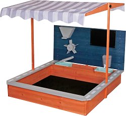 Детският дървен пясъчник от GINGER HOME е перфектното място за игра на открито за вашите деца. Той съчетава функционалност, безопасност и забавление, като е идеален за двора, градината или други външни пространства. Изработен от висококачествена ела, обработена за дълготрайност и сигурност, този пясъчник бързо ще се превърне в любимото място за игра на всяко дете. Пясъчникът разполага с регулируем покрив, който е UV и водоустойчив – предпазва децата от слънце и дъжд и осигурява комфорт по време на игра. На задната стена на пясъчника са разположени забавни и образователни елементи: пясъчна фуния, въртяща се мелница, ...