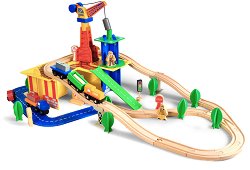 Играчките от дърво винаги са притежавали особен чар и топлина. А комплектът "Строителна площадка" ще зарадва всяко дете! Той е подходящ за малчугани над 3-годишна възраст и се състои от влакче, релси, фигурки на човечета, пътни знаци, дървета, кран и аксесоари. Локомотивчето тегли 2 вагончета, които се прикрепват едно към друго посредством магнити. Аксесоарите, които допълват пейзажа, също са от дърво и ще допринесат за по-голямо забавление по време на игра. Детето може да разполага релсите където пожелае и да разиграва различни истории с фигурките. Комплектът развива въображението, помага за усъвършенстване на ...