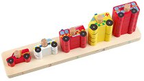 Комплектът от Goki е подходящ за деца над 2-годишна възраст и представлява сортер. Състои се от подложка за подреждане и 5 цветни фигурки на колички в различен цвят и размер. Елементите са изработени от дърво, боядисано с безвредни бои на водна основа. Подреждайки ги, детето ще се научи да брои, да прави разлика между малко и голямо, ще разпознава цветове и ще развие своята координация. Подложката е с размери 17.5 x 13.5 cm. ... |