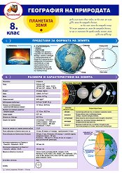 Помагалото е оформено като дипляна с формат A4 (размери в разгънат вид: 44 x 32 cm). Помагалото включва: представи за формата на Земята; размери и характеристики на Земята; движения на Земята; геосферен строеж на планетата Земя; атмосфера; хидросфера; литосфера; педосфера; биосфера; глобални проблеми и устойчиво развитие. Настоящото издание е съвместимо с учебната програма за 2025/2026 г. Ако имате нужда от подвързия за различни формати учебници, тетрадки и учебни помагала, посетете нашата специална секция Подвързии. ...