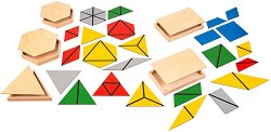Образователният комплект е подходящ за деца над 3-годишна възраст. С него малчуганите ще се запознаят с геометричните форми и как те могат да бъдат съставени от триъгълници. Комплектът включва 2 правоъгълни кутии, 2 шестоъгълни кутии и една триъгълна кутия, като в тях ще откриете цветни фигури за сглобяване на съответната геометрична форма. Частите са изработени от дърво, боядисано с безвредни бои на водна основа. Играейки с комплекта, децата ще развиват своето логическо мислене, цветоусещане и координация. За метода на Монтесори Революционен образователен метод - така би звучало най-краткото обяснения на подхода & ...
