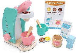 Децата обичат да имитират родителите си и тяхното поведение. Със сигурност много от тях са видели мама или татко с чаша горещо кафе. Сега децата имат възможността също да приготвят кафе за своите приятели, благодарение на тази дървена кафемашина. А кой как обича кафето си – с или без захар и мляко? Комплектът съдържа кафемашина, 2 чашки за кафе, 2 лъжички, захарница, кутия мляко, ледчета, капсули за кафемашината и меню. За да бъде играта още по-реалистична, детето ще може да вдигне и свали капачето на машината и да върти бутона. Играта с комплекта развива въображението и координацията на детето, докато го забавлява. ...