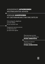 Двуезично издание на български и немски език. ... "Настоящият сборник "Избрани афоризми и цитати от български автори" е представен и в превод на немски език, като преследва по този начин и учебни цели. Афоризмите и цитатите са подредени хронологично - от началото на Българското възраждане с "История славянобългарска" на Паисий Хилендарски до нашето съвремие. Мисля, че понятието "цитат" е пределно ясно за евентуалния бъдещ читател. Що се отнася до термина "афоризъм", той е понятие от раздел "фразеология" на лексикологията, сродно с "пословица", " ... |