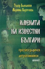 Просопографичен антропонимикон. ... Идеята за създаване на антропонимикон с обяснение на особеното в имената на известните българи се породи през 1989 г. у един от авторите на този труд ( Тодор Балкански ). Авторите са направили опит да обхванат представители на всички групи от българите, на видни представители на малцинствата, в друг план - на ханове, царе, войводи, военачалници, аристократи, германци, писатели, артисти. Екстралингвистичната информация при едни имена е сведена до нула, при други, предимно па представители на външните българи, е по-пълна само в просопографската част, което предопредели и надслова: ... |