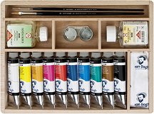 Маслените бои от серията Van Gogh на Royal Talens имат интензивен цвят, съставен от пигменти с висока концентрация и растително масло. Отличават се с кремообразна консистенция и плътност. Различните цветове се смесват без усилие помежду си, както върху палитрата, така и върху платното при работа мокро в мокро alla prima за получаване на производен цвят. Могат да се нанасят директно от тубичката с помощта на шпатула, четка или да се разреждат с разредители. Позволяват да се смесват с медиуми и структурни пасти, които променят техните цветове или свойства. Маслените бои Van Gogh са подходящи за начинаещи, ... |