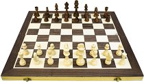 Италианската фирма "Modiano" предлага богата и разнообразна колекция от шахове, табли и други настолни игри. Всички те се открояват по своя стил и качество. Дъската е изработена от дърво, с изпечатани квадратчета 40 x 40 mm. Гърбът ѝ е облицован с покритие наподобяващо кадифе и има ластици, които държат всяка една фигурка на място. Дъската е в комплект с дървени фигури. Размери на фигурите: пул: ∅ 28 x 7 mm пешка: ∅ 15 x 34 mm кон: ∅ 17 x 40 mm топ: ∅ 17 x 35 mm офицер: ∅ 18 x 50 mm цар: ∅ 20 x 65 mm царица: ∅ 20 x 60 mm ... |