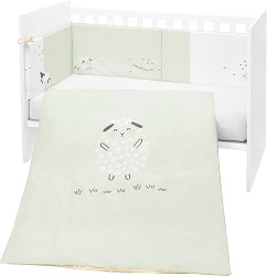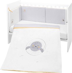 Спалният комплект за бебешко креватче от серията "Fantasia" на "Kikka Boo" е изработен от висококачествен 100% памучен ранфорс, който е мек и нежен на допир до чувствителната бебешка кожа. Пълнежът на олекотената завивка и обиколникът е направен от 100% полиестерна вата, която е безвредна за децата. Комплектът се състои от плик за олекотена завивка, олекотена завивка и малък обиколник. Обиколникът е разделен на 3 еднакви части, които се прикрепват лесно към предпазните решетки на бебешкото креватче посредством връзки. По този начин те обгръщат вътрешната страна на леглото и предпазват бебето от ... |