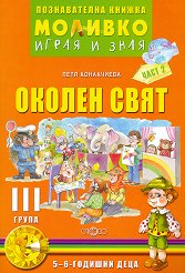 За деца на 5-6 години. ... "Предлагаме ти интересно пътешествие в света около теб. Ще бъдеш с героите на тази чудна книжка - четирима приятели от детската градина.Заедно ще наблюдавате как се променя времето през различните сезони, ще бъдете в града и на село. Ще научите повече за растенията и животните и какви грижи трябва да се полагат за тях. С героите на кнжиката ще отидете до поликлиниката, в училище или на театър, ще се запознаете с различни професии и ще научите много за правилата на улицата, правилата по време на буря, пожар или наводнение. Забавлявай се с нашата книжка, с игрите и задачите в нея, които много ... |
