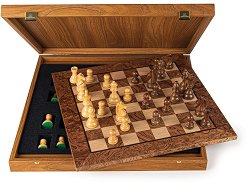 Понякога шахът се превръща в много повече от игра. Докато за едни предстоят първи стъпки в местенето на фигури и обмислянето на стратегически ходове, за други шахът вече е страст и любимо хоби. А за трети може да е дори и начин на живот, протичащ в турнири. За почитателите на играта шах от Manopoulos предлагат луксозен комплект, който ще бъде подходящ подарък, независимо от повода. Той се състои от кутия, основа за игра на шах и 32 дървени фигури в светло и тъмно кафяв цвят. Кутията е изработена от висококачествен дървен материал - орех, и е с размери 40 x 40 cm. От вътрешната страна разполага с място за съхранение на ... |
